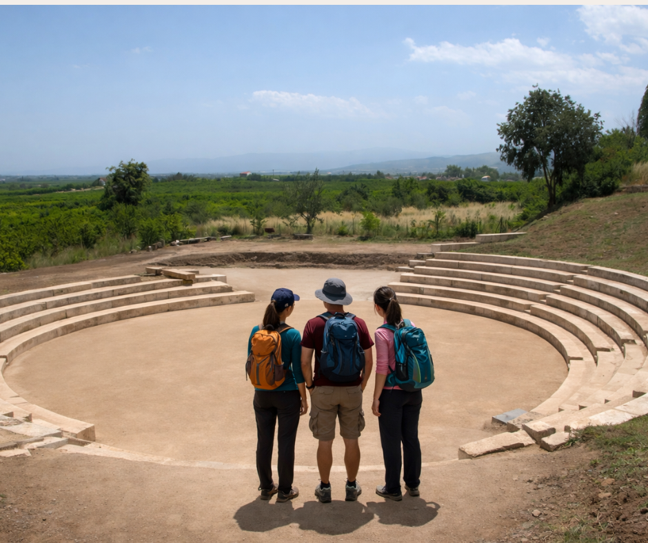 Αφήνοντας πίσω μας την αρχαία Μίεζα, συνεχίζουμε την πορεία μας μέσα στον κάμπο με τις ανθισμένες ροδακινιές. Το τοπίο παραμένει γεμάτο ροζ χρώματα και το φως της άνοιξης κάνει τα χωράφια να μοιάζουν ζωγραφισμένα. Ο αέρας μυρίζει γλυκά από τα άνθη και σε κάθε βήμα νιώθουμε χαλάρωση και ηρεμία, ενώ οι ήχοι της φύσης δημιουργούν μια αίσθηση γαλήνης. Έτσι, σχεδόν ανεπαίσθητα, αρχίζουμε να ανηφορίζουμε προς το Νυμφαίο – Σχολή Αριστοτέλη, που βρίσκεται μέσα σε ένα καταπράσινο και ήσυχο τοπίο, στις παρυφές του Βερμίου, εκεί όπου το φυσικό περιβάλλον μοιάζει ιδανικό για φιλοσοφική σκέψη και διδασκαλία.